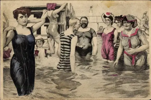 Künstler Ak Frauen und Männer in Bademoden, Badeanzug, Simplicissimus