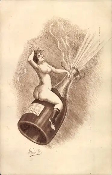 Künstler Ak Fredillo, nackte Frau auf einer Champagnerflasche
