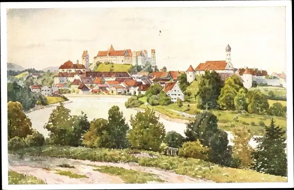 Künstler Ak Füssen am Lech Allgäu, Gesamtansicht der Stadt aus der Ferne