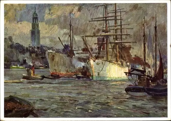 Künstler Ak Gabel, P. E., Hamburg, Hafenpartie, Segelschiff, Stadtansicht