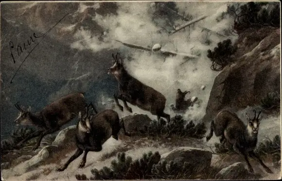 Künstler Ak Gämsen fliehen vor einem Erdrutsch