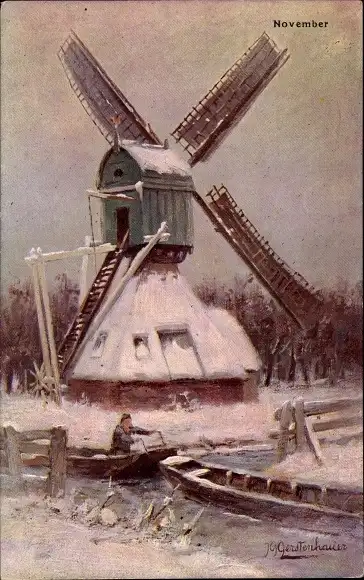 Künstler Ak Gerstenhauer, J. G., Windmühle, Mann am Zaun, Allegorie, November
