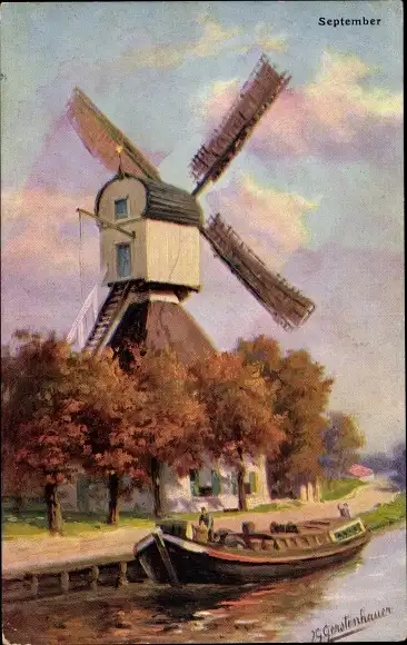 Künstler Ak Gerstenhauer, Johann Georg, Alte Windmühle am Wasser, Allegorie, September