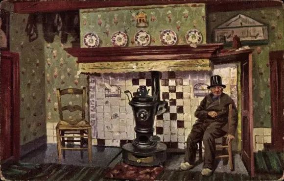 Künstler Ak Gerstenhauer, Mann in Stube, Ofen, Herd