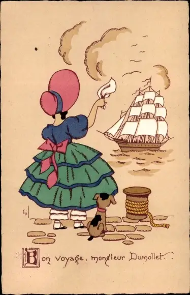 Künstler Ak Gil, Mädchen winkt zum Abschied einem Segelschiff hinterher