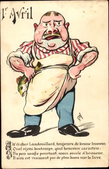 Künstler Ak Glückwunsch 1. April, Mann mit Fisch, Schürze