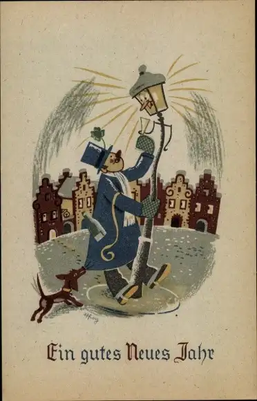 Künstler Ak Glückwunsch Neujahr, Betrunkener an Straßenlaterne, Dackel