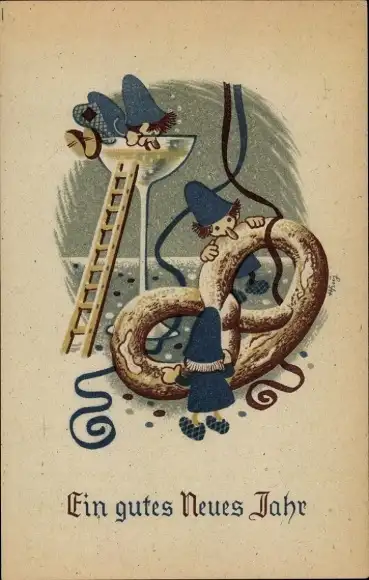 Künstler Ak Glückwunsch Neujahr, Brezel, Sektglas