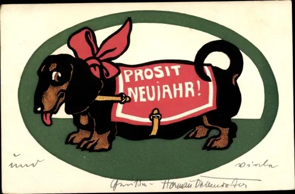 Künstler Ak Glückwunsch Neujahr, Dackel, Rote Schleife