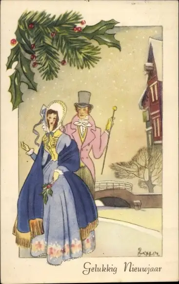 Künstler Ak Glückwunsch Neujahr, Elegantes Paar, Stechpalmenzweig