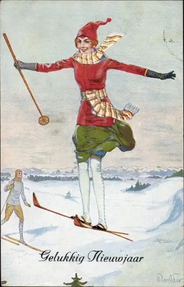 Künstler Ak Glückwunsch Neujahr, Frau auf Skiern, Skisprung