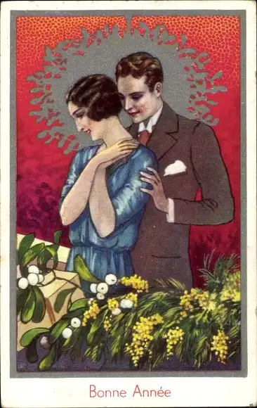 Künstler Ak Glückwunsch Neujahr, Misteln, Liebespaar