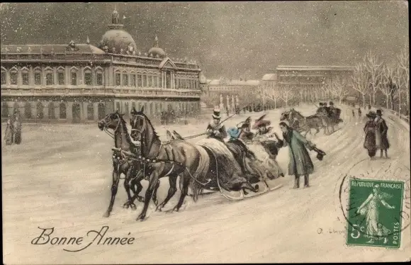 Künstler Ak Glückwunsch Neujahr, Schlittengespann in der Stadt