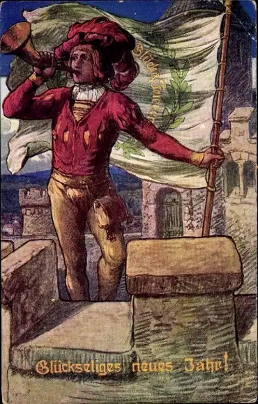 Künstler Ak Glückwunsch Neujahr, Trompeter, Fahne