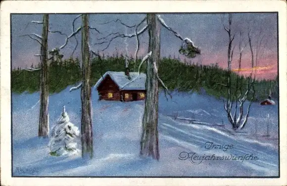 Künstler Ak Glückwunsch Neujahr, Wohnhaus, Winter, Schnee