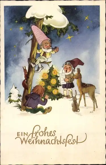 Künstler Ak Glückwunsch Neujahr, Zwerge, Tannenbaum, Reh, Hase