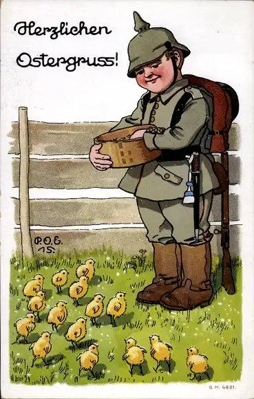Künstler Ak Glückwunsch Ostern, Küken, Junge in Uniform