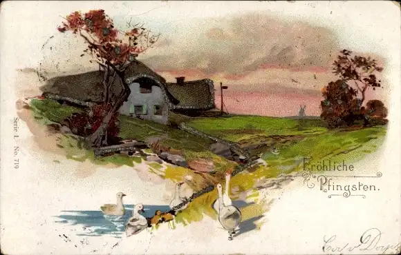 Künstler Ak Glückwunsch Pfingsten, Dorfpartie, Häuser, Gänse