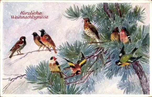 Künstler Ak Glückwunsch Weihnachten, Vögel in einem Nadelbaum, Primus