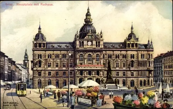 Künstler Ak Graz Steiermark, Hauptplatz, Rathaus, Markt, Straßenbahn