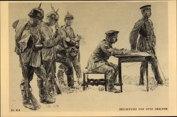 Künstler Ak Greiner, Otto, Soldaten in Uniform mit Gewehren, Schreibtisch, Pickelhaube
