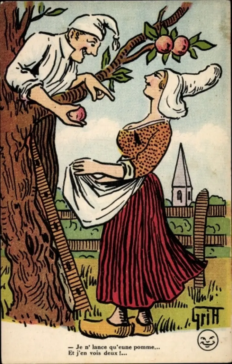 Künstler Ak Griff, Je n'lance qu'eune pomme, Mann auf einem Apfelbaum, Frau mit Holzschuhen