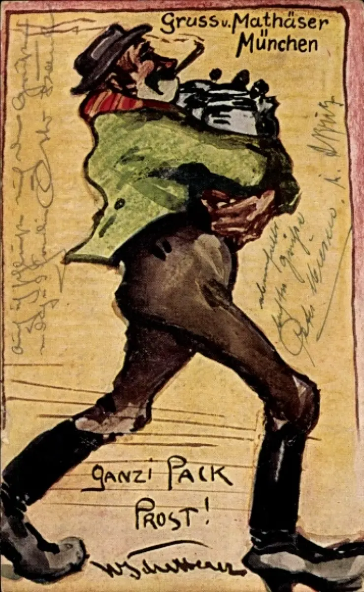 Künstler Ak Gruß vom Mathäser in München, Ganzi Pack Prost