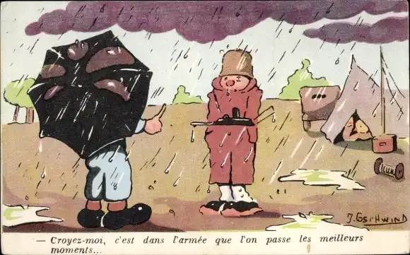 Künstler Ak Gschwind, Männer im Regen, Zelt, Soldat