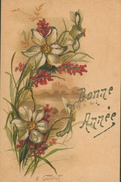 Künstler Ak Guillat, E., Glückwunsch Neujahr, Blühende Blumen