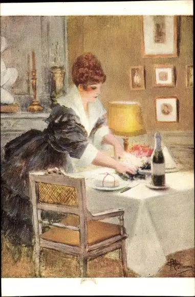 Künstler Ak Guillaume, A., Pour mon Filleul, Frau deckt Tisch, Champagner
