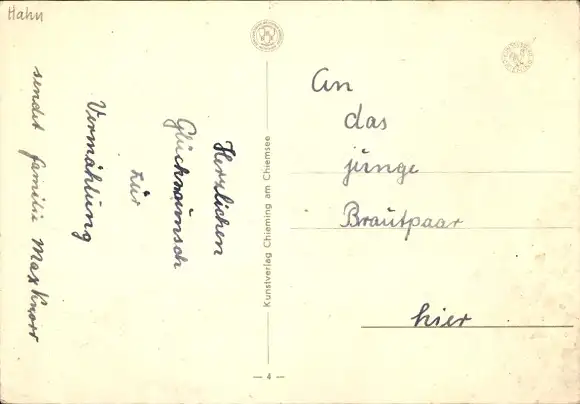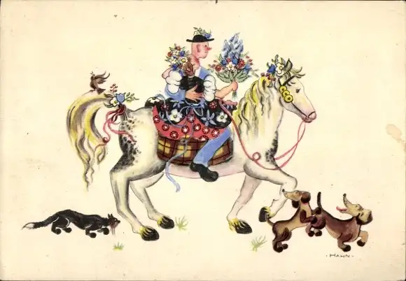 Künstler Ak Hahn, Liebespaar, Pferd, Blumen, Dackel, Katze