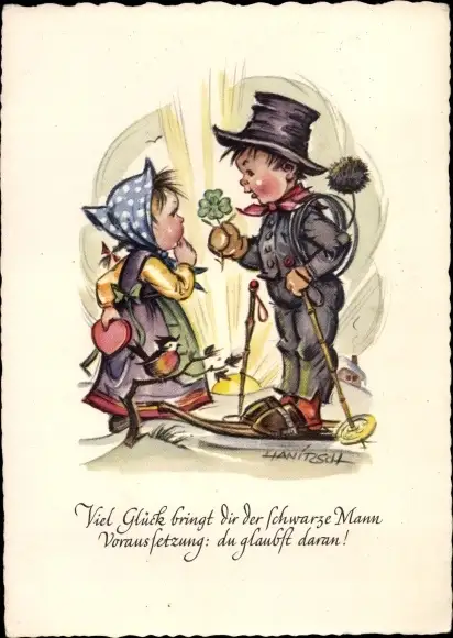 Künstler Ak Hanitzsch, Glückwunsch Neujahr, Schornsteinfeger auf Skiern, Kleeblatt