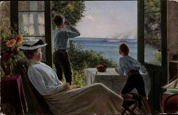 Künstler Ak Hansen, Sigvard, Flottenmanöver, Jungen beobachten Kriegsschiffe