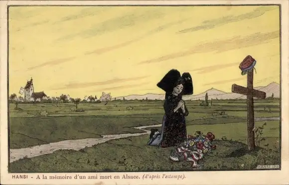 Künstler Ak Hansi, Betende Frau in elsässer Volkstracht, Soldatengrab