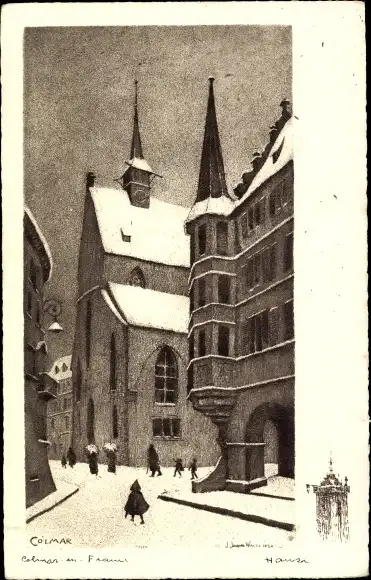 Künstler Ak Hansi, Jean Jacques Waltz, Colmar Kolmar Elsass Haut Rhin, Straßenpartie, Winter