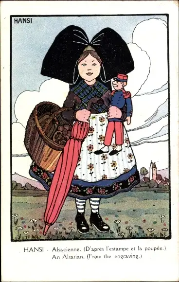 Künstler Ak Hansi, Mädchen in elsässer Volkstracht mit Puppe