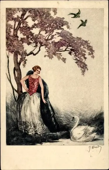 Künstler Ak Hardy, Jean, Art Deco, Frau mit Schwan