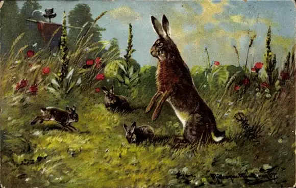 Künstler Ak Hasen, Blumenwiese, Vogelscheuche