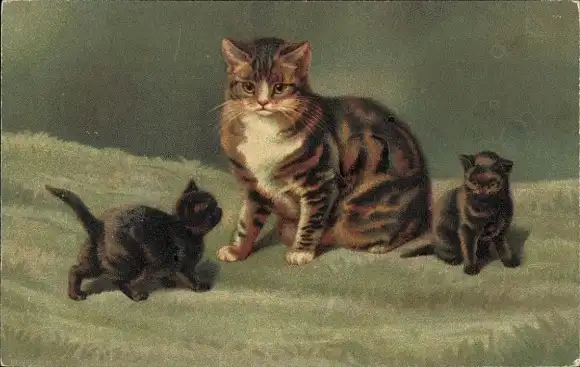 Künstler Ak Hauskatzen, Katzenmutter mit ihren Kätzchen