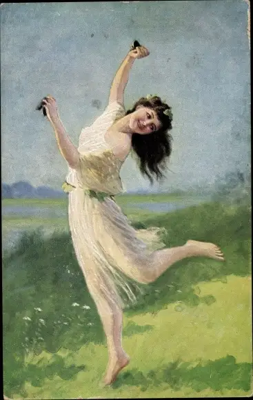 Künstler Ak Hering, Adolf, Frühling, junge Frau mit Kastagnetten auf einer Wiese