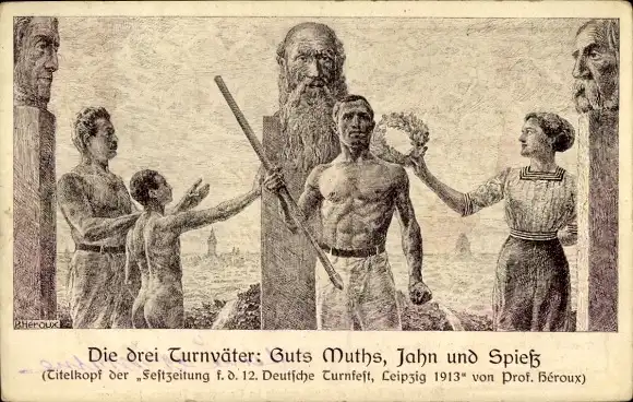Künstler Ak Héroux, Die drei Turnväter, Guts Muths, Jahn und Spieß