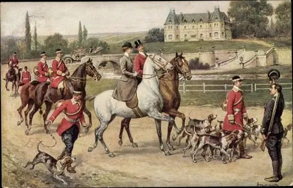 Künstler Ak Hetzjagd, Jagdhunde, Meute, Reiter, Schloss