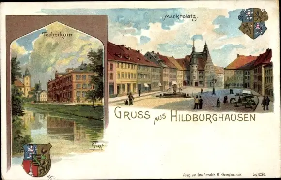 Künstler Ak Hildburghausen in Thüringen, Technikum, Marktplatz, Wappen
