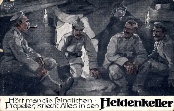 Künstler Ak Hört man die feindlichen Propeller, kriecht alles in den Heldenkeller, Landsers Leben