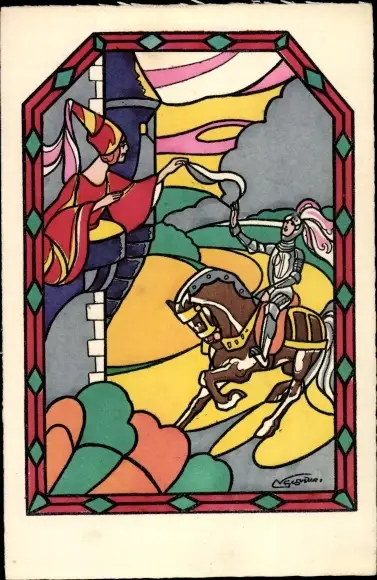 Künstler Ak Hofdame am Fenster grüßt einen Ritter