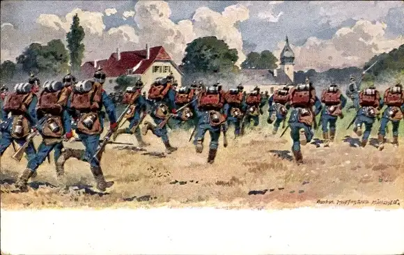 Künstler Ak Hoffmann, Anton, Deutsche Soldaten in Uniformen, Marschgepäck, Attacke