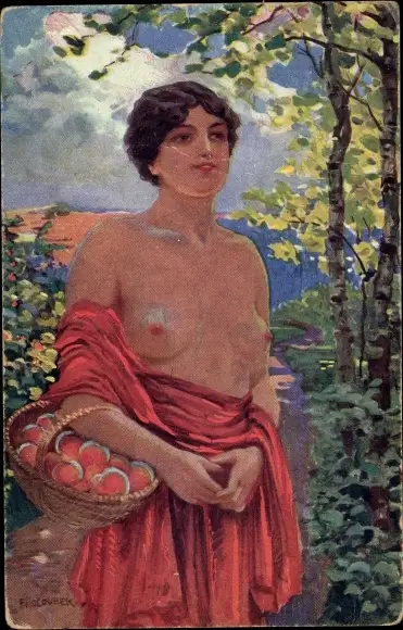Künstler Ak Holoubek, Frau mit entblößter Brust, Obst im Korb