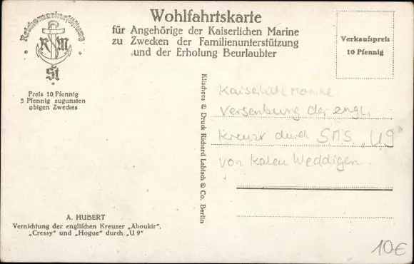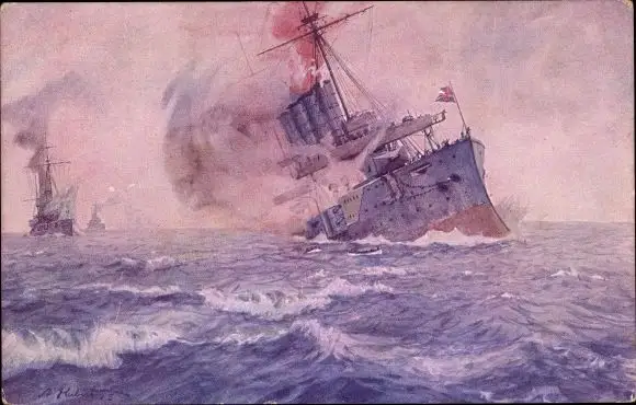 Künstler Ak Hubert, A., Vernichtung engl. Kreuzer Aboukir, Cressy und Hogue durch SM U 9