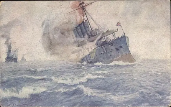 Künstler Ak Hubert, Deutsches U Boot, U 9 vernichtet englischen Kreuzer Aboukir und Cressy