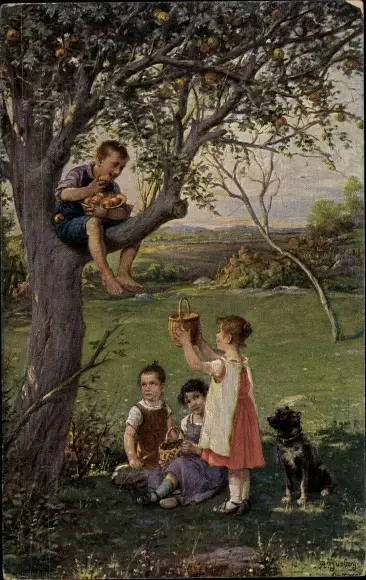 Künstler Ak Humborg, Schenk uns auch Äpfel, Kinder unter einem Apfelbaum